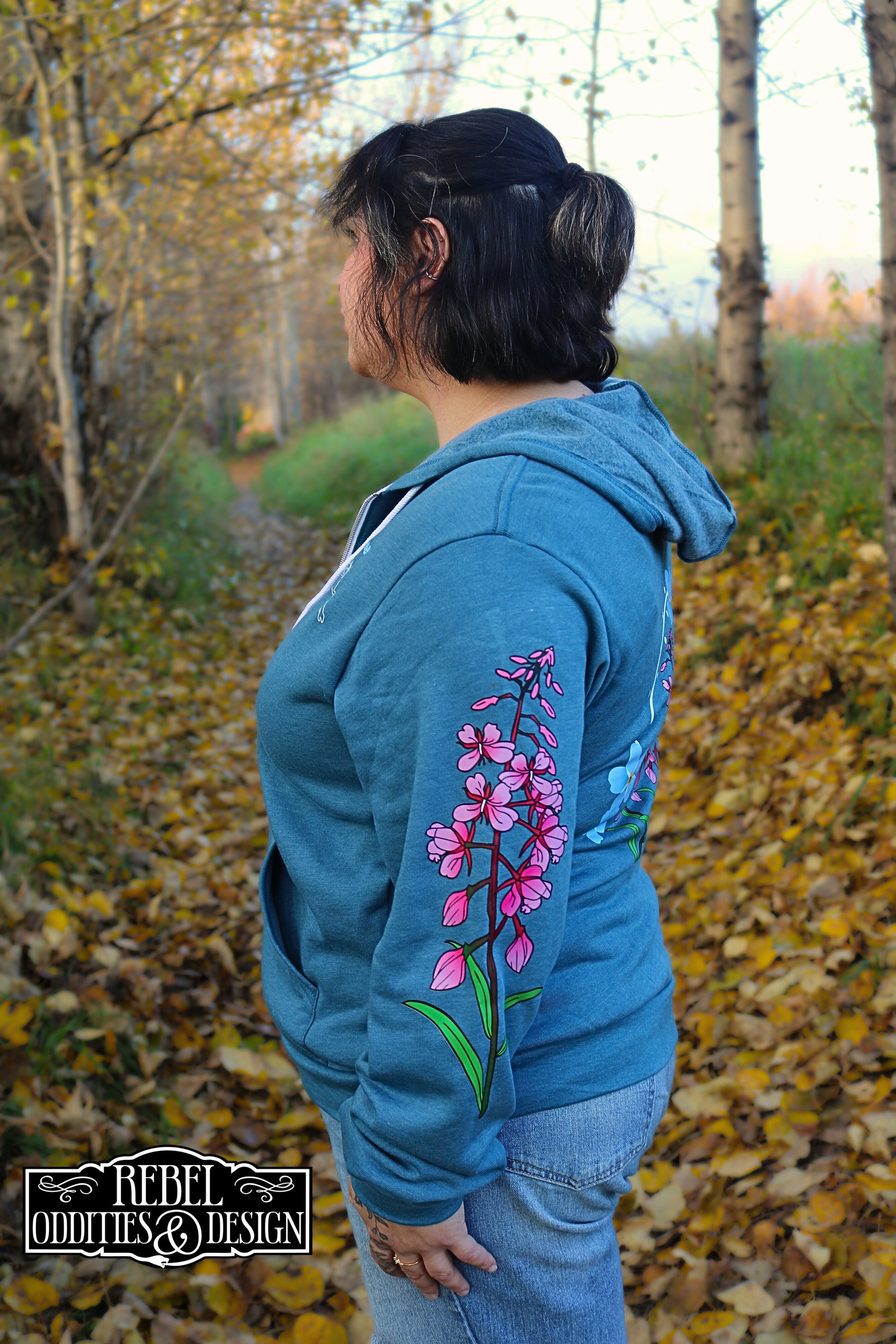 Each hoodie features a Fireweed and Forget-Me-Not back, an outline of Alaska on the chest, a leather patch on the pockets, and fireweed climbing up the sleeves.