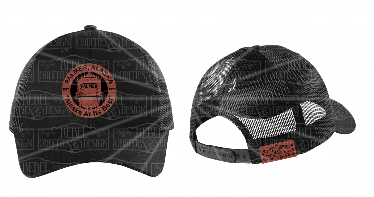 A black mesh-style trucker hat with a leather patch on the front and the Rebel Oddities logo in leather on the side. The patches are handmade and designed by Rebel Oddities!
